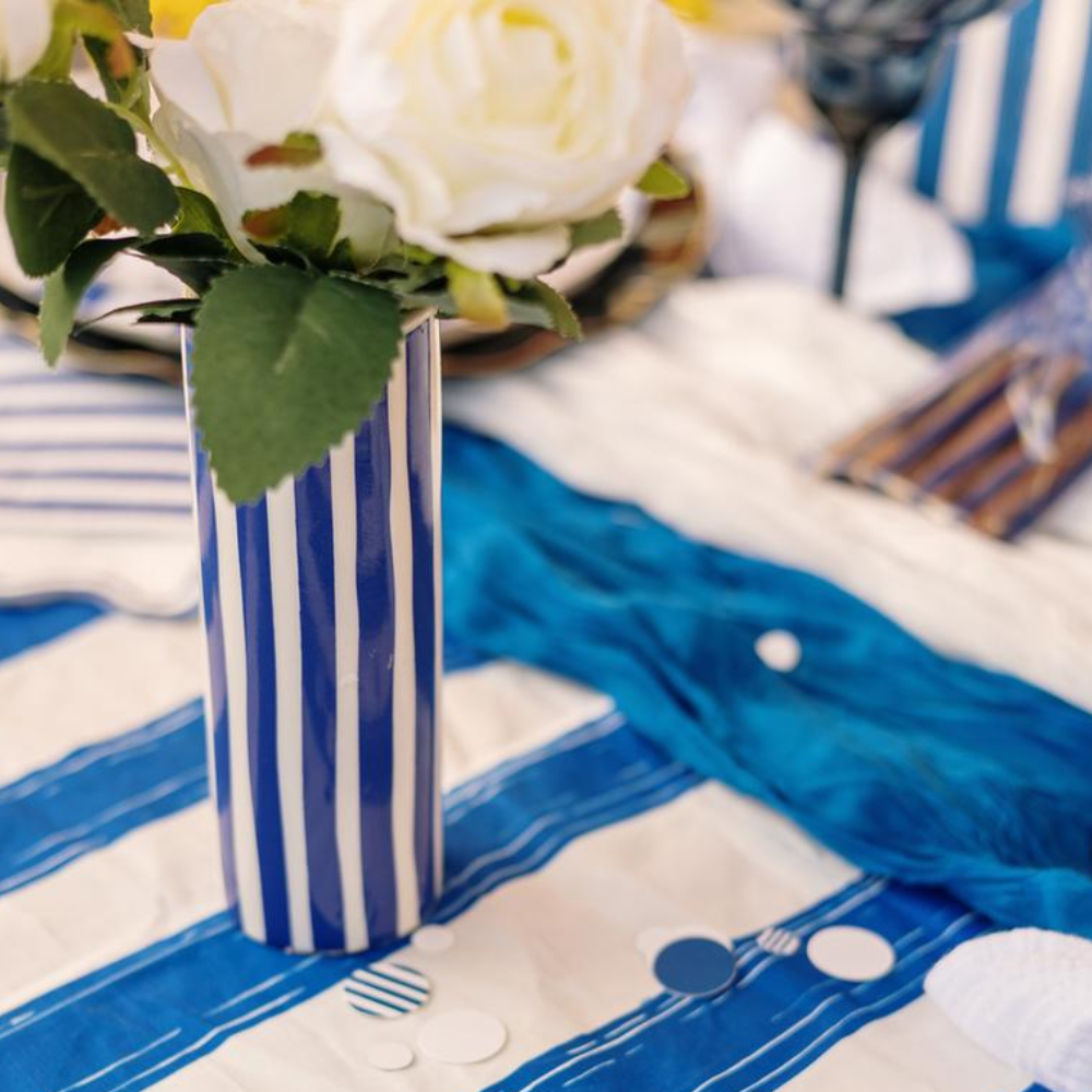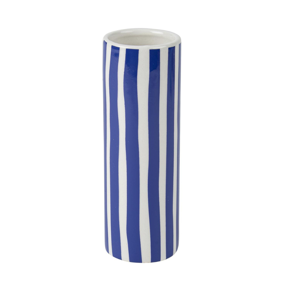 Plongez dans une ambiance ensoleillée avec notre vase en céramique à rayures, bleu et blanc!